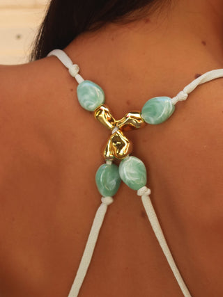 Crafted from a soft mesh fabrication and fully lined for comfort, Albia is cut to a femme silhouette with a cowl drape neckline and fluid tie-front detail that sits at the hip. The figure skimming mini length is balanced by intricate bead and gold hardware embellishments at the straps and back. The side cut-outs and asymmetric draping sculpt the body while still feeling effortless and breezy.