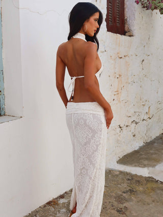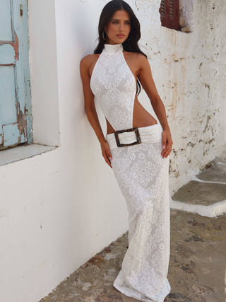 Crafted from stunning white lace lined with mesh for a slightly sheer finish, this head-turning maxi features a high neckline with a button closure and an adjustable back tie for the perfect fit. The front gathered waistband is detailed with a luxe resin tortoise shell buckle, adding a touch of glam to this feminine silhouette. Designed to elongate the figure, Albinae is the ultimate elegant yet playful maxi.