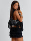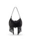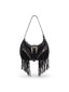 Designed in a textured faux leather look, it features bold silver hardware, an oversized buckle, zip accents, and fringe tassels for a subtle western edge.