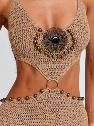 Crafted from true knit crochet, she features a halter neckline with statement centre front ring hardware and a bold disc detail at the bust. Designed with beaded accents along the bust and skirt edge, she creates a striking silhouette with a handcrafted feel. Perfect for vacations, euro summer styling, and festival nights.