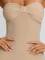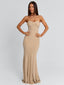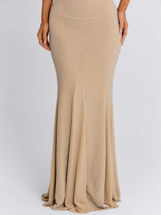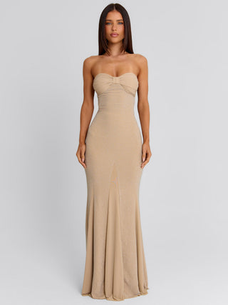 Meet our Gabriele Maxi Dress in Gold, a refined statement designed to sculpt and shine. Crafted from lurex mesh, she features a strapless neckline with a softly structured bust that enhances the silhouette. The bodycon fit hugs your shape, while subtle contrast godet panels add movement and a flattering flow through the skirt. Perfect for formals, proms, weddings, or evening events.