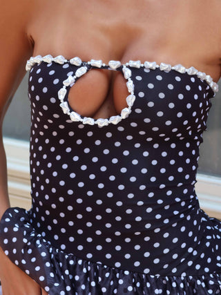 Crafted from printed mesh and fully lined for a smooth, body-hugging fit, she features a strapless sweetheart neckline with pearl-like bead detailing and a flirty bust cut-out. Her tiered polka dot mesh skirt falls to an asymmetric hem that moves with you, finished with a concealed back zip for ease.