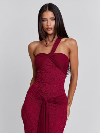 Crafted from a lace fabrication and fully lined, Irma features contrast jersey panelling that enhances the figure. The design is finished with a fixed waist tie that drapes elegantly, creating a flattering silhouette. With its one-shoulder neckline and floor-skimming length, this dress is the epitome of effortless sophistication!