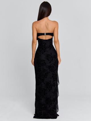 Crafted from lace and lined in soft polyknit, Julian features a strapless neckline with a delicate floral detail at the centre. The fitted bodice flows into a full maxi skirt with a high thigh split and soft flounce, adding movement while keeping the look refined.