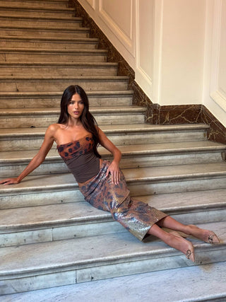 Crafed from a shimmering sequin fabrication with a sleek, body-skimming silhouette, Loriela is fully lined for comfort! She catches the light beautifully and flatters the figure with its midi-length, body-con fit. The perfect balance of elegance and allure, she’s designed to stand out, whether for a night out, party, or special occasion.