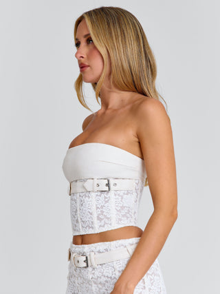 Designed with a sheer lace bodice and structured boning, this cropped corset-style top shapes and supports through the body. Cream-toned PU detailing at the bust creates contrast and support, while a lace-up corset back allows for an adjustable fit. Finished with a side zip for easy wear, the top blends soft lace with bold detailing for a statement finish.