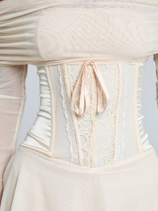 Designed with a mesh overlay and sleeves, she features a sculpted bodice made from satin, lace, and mesh, complete with supportive boning for a flattering fit. An adjustable lace-up back allows you to customise the shape, while the fully lined skirt keeps her comfortable and easy to wear.
