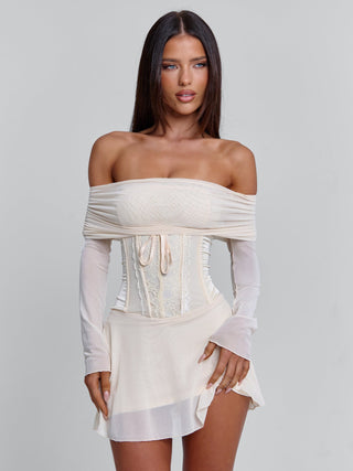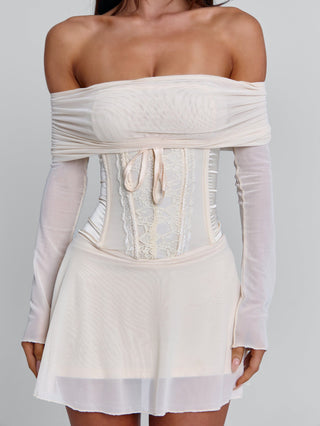 Our Orla Mini Dress in Beige blends soft romance with modern detailing.