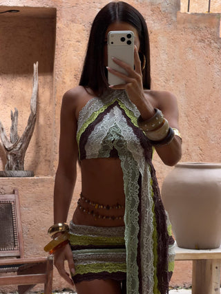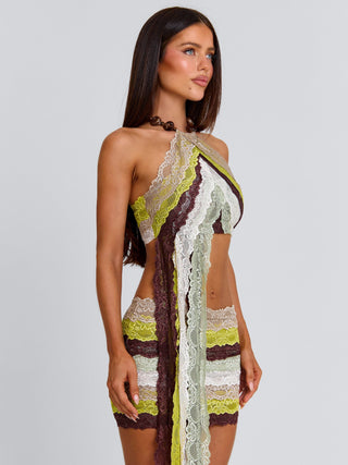 Meet our Oslo Top in Green Stripe. Crafted from stretch lace and lined with soft polyknit, she features a halter silhouette with a statement beaded necklace detail that sits at the neckline. The layered lace panels create a striking striped effect while the adjustable necklace length allows for a customizable fit. Perfect for spring break, parties, and summer nights out.