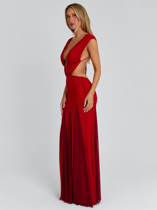 Crafted from a fully lined mesh fabrication, this striking red maxi features a plunging neckline with sculpted cut-outs through the waist for a bold, feminine silhouette. Soft gathering through the shoulders adds shape and movement, while the open back is finished with a delicate tie detail for an adjustable fit. The skirt flows into contrast darker red godets, adding depth and fluid movement as you walk.