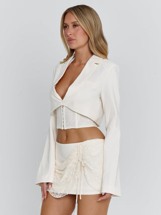 Crafted with a structured two-piece design, she features a power mesh corset base layered beneath a cropped blazer overlay for a sleek, sculpted finish. The collared neckline adds a tailored touch, while the hook and eye closure ensures a secure fit. Designed to be worn together or styled separately, this versatile piece transitions effortlessly from day looks to elevated evening styling.