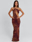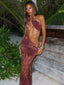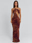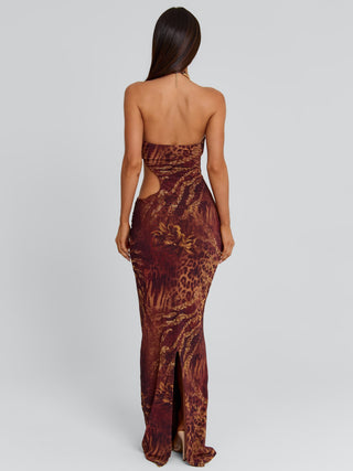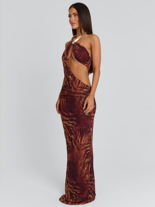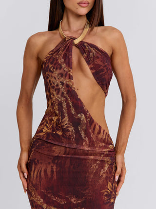 Crafted from power mesh with our exclusive Rayella print, she features an asymmetrical bust with a statement gold necklace detail. Cut-out shaping through the waist enhances the silhouette, while the centre back split adds movement to the sleek maxi design.