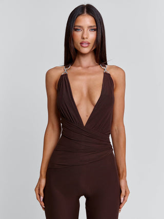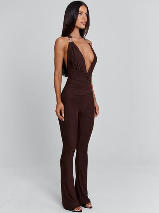 Get ready to turn heads in the show-stopping 'Carys Jumpsuit' in Chocolate!