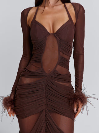 Featuring a mix of lined and sheer panels, she creates subtle dimension through the body, enhanced by soft gathering that shapes the waist and hips. An adjustable neck tie and back zip ensure a smooth, personalised fit, while the matching mesh bolero, finished with feather-trim cuffs, adds a touch of texture.