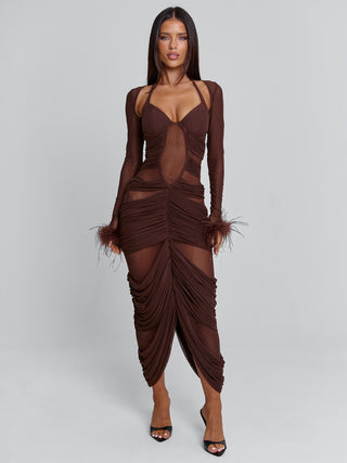 The Cherrey Maxi Dress in Chocolate is a beautifully crafted mesh silhouette designed to flatter!