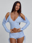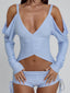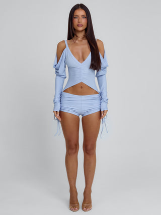 Crafted from lightweight stretch rib, Elani features a fitted long sleeve top with a V neckline, cold shoulder cut outs, and a soft draped cowl detail at the sleeve. The matching mini shorts sit mid on the waist with an adjustable drawstring, while the stomach cut out creates a bold, sculpted finish. Partially lined for coverage, she’s perfect for festivals and summer nights.