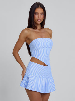 Meet our Elija Mini Dress in Blue Stripe, she’s a structured mini designed for summer plans.