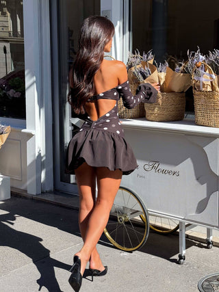 Sweet and playful with a modern twist, our Elysha Mini Dress in Choc Polka Dot is the perfect piece for your next party or fall event.