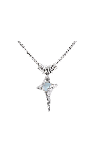 This cross design necklace is enhanced with a captivating moonstone that exudes luxury. She has silver rings in the centre that fall to the middle when worn to add a touch of edge.
