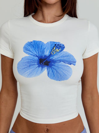 Designed in a fitted baby tee silhouette, she’s crafted from a soft jersey fabrication that hugs the body for a clean, flattering fit. A bold centre front flower graphic adds a statement finish, summer-ready feel. Designed with a classic ribbed neckline and cropped length, she pairs effortlessly with denim, minis, or our matching Ginger Midi Skirt for a coordinated look.