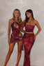 Crafted from a printed mesh fabrication and lined for comfort and fit, Heidi sits at a mini length low-rise on the waist. She is designed with cut-outs at the hips to showcase skin, and is designed with silver 'O' rings and flounced detailing to add a touch of femininity.