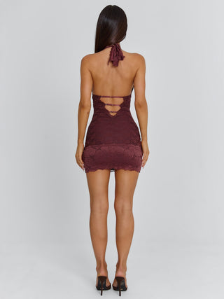 Crafted for a floral lace and mesh fabrication, India features a bust-flattering plunge neckline, with scalloped lace detailing that exudes femininity. She has a body-con fit that flatters your figure, sitting at a mini length that showcases your legs. India has adjustable strap detailing at the back to ensure you get your desired fit'.