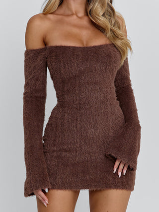 Our Juno Mini Dress in Brown is a cosy-meets-confident silhouette designed for cooler nights out.