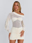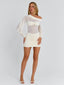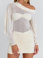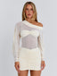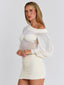 Crafted from soft mesh fabrication with a partial poly-knit lining, she features an off-shoulder neckline with a thick, lined band that offers subtle support. A bandeau layer is sewn over the sheer mesh bodice, creating a clean, structured look, while billow sleeves with gathered cuffs add soft volume. Finished with a ruched mini skirt that hugs the body, Kilie is designed to flatter with an effortless, feminine finish.