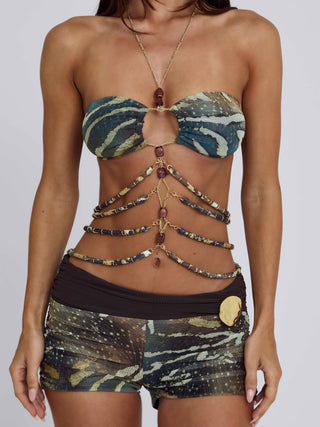 Crafted from mesh fabrication, she features a strapless bandeau design with chain and bead detailing that drape across the bodice. Rouleau straps with a gold ring detail add dimension, while internal silicone grip tape at the bust ensures she stays perfectly in place. Finished with a back clasp closure, she’s secure yet daring.