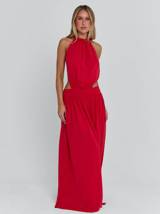 Crafted from lightweight georgette fabrication, Loretta features a high neckline with soft draping through the bodice and waist. A low open back with a slim vertical strap adds a subtle statement, while the flowing maxi skirt creates movement and an elongated silhouette.