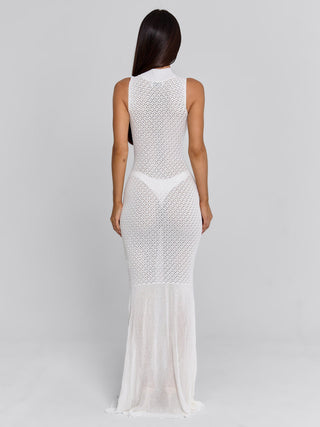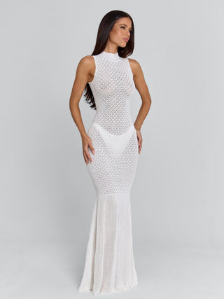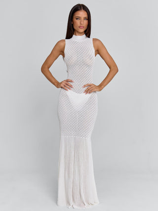 Crafted from a soft true knit fabrication, Loriel is designed to contour the body with a smooth, flattering fit. Featuring a high neckline and intricate knit detailing throughout, she falls into a subtle mermaid hem that elongates the silhouette. Designed to be worn without undergarments, this style offers a seamless, refined finish.