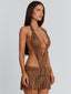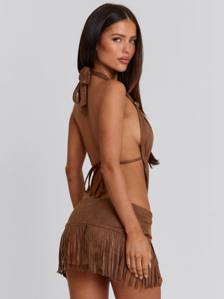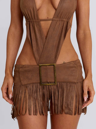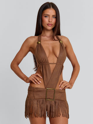 Crafted from faux suede, she features a plunging halter neckline with antique brass bead details and an overlapping bodice that contours the body. A low-rise mini skirt with fringe adds movement, while the adjustable under bust tie allows for a customised fit. Designed with an internal bodysuit for support, she’s made for statement styling, perfect for your next music festival!