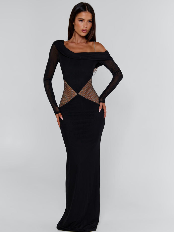 Crafted from soft black jersey, she features sheer mesh panels at the waist adorned with sparkling diamante detailing for a bold, sculpted look. The asymmetrical neckline and delicate shoulder chain strap add a touch of edge, while her long sleeves and body-con fit balance sexy and elegance.