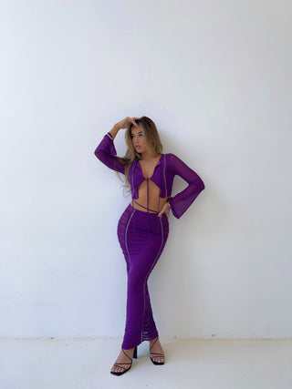 Our 'Maddy' maxi skirt in purple has a simple yet sexy vibe for effortless dressing this season. Cut from a light weight mesh and a lilac trim, this elevated mesh skirt is dreamy. Style on it's own or match with our Maddy Crop Top. Runched, gathered side detail.