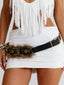 This statement belt combines a PU leather base with plush faux fur paneling for striking contrast. Finished with brass-toned studs and medallion hardware detailing, it brings the perfect western-inspired touch to any outfit.