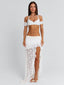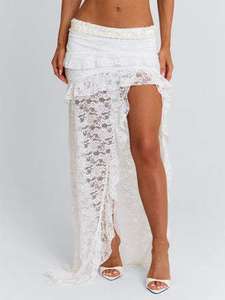 Meet our Rivana Maxi Skirt in White, a statement lace skirt designed with soft movement. Crafted from lace with a lined mini skirt base, she features a high leg split and is finished with faux shell disc trim along the waistband for a subtle decorative detail. Designed to pair effortlessly with the Rivana Top, she brings an elevated finish to the set.