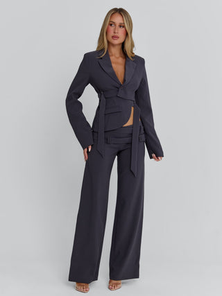 Designed to complete the Riveria set, she features a low-rise fit with a wide leg silhouette for effortless impact. Belt strap detailing adds a sharp finish, making her the perfect balance of tailored and business chic!