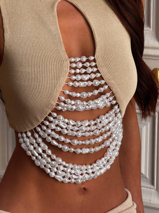 Crafted from a soft knit base and fully lined for ease of wear, she features cascading draped pearl strands across the front, creating a statement that feels both modern and romantic. A high neckline frames the silhouette, while an open back with button fastening adds a touch of allure.