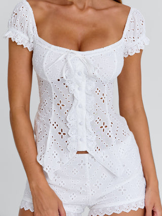 Crafted from lightweight cotton broderie anglaise, Selvia features an off-shoulder neckline with soft ruffle detailing for a feminine finish. A shirred back panel adds comfort and gentle stretch, while the structured front keeps the fit flattering and secure. Designed to sit cropped on the body, she pairs perfectly with the matching Selvia Shorts for an easy co-ord look.