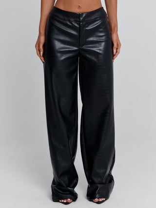 Crafted from embossed croc PU, she features a mid-rise waist and a relaxed, baggy leg for a flattering yet laid-back fit. Designed to elevate any look, from casual layering to statement evening wear, these pants are an essential for your winter wardrobe.