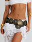 Meet our Sloane Belt in Black, a statement accessory designed to elevate any look. She features black circular panels detailed with gold-tone eyelets, creating a bold yet refined contrast. Finished with an ornate engraved gold-tone buckle!
