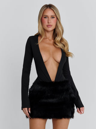 Crafted from a smooth jersey fabrication, Zanira features a super plunging neckline that creates a bold, sculpted look. Long sleeves balance the silhouette, while the faux fur mini skirt adds texture and contrast. Finished in a body-con fit that hugs the figure!