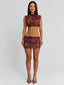 Meet our Zaria Mini Dress in Rayella, a striking silhouette designed to contour the body. Crafted from stretch mesh, she features a high neckline and fitted mini shape with an open back for a bold finish. Detachable gold snake chains wrap around the waist to accentuate the silhouette, adding a statement detail that elevates the look.