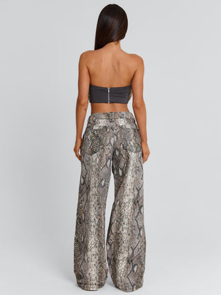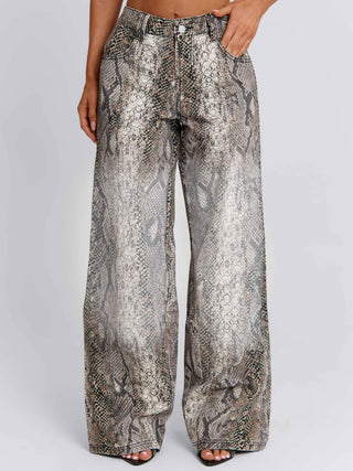 Meet our Zeriah Pants in Snake Print, a relaxed denim silhouette designed with a bold statement print. Crafted from printed denim with washed knee detailing, she features a low-rise waist and a baggy fit for an effortless, laid-back look. Finished with a branded silver post button, she pairs perfectly with the Zeriah Top for festival styling.