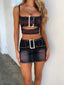 Turn up the heat wearing Zev - Crafted from a soft stretch denim fabrication, this iconic crop designed with adjustable shoulder straps, featuring a thick adjustable silver buckle feature at the bust with a cut out detail. This crop top is anything but basic.